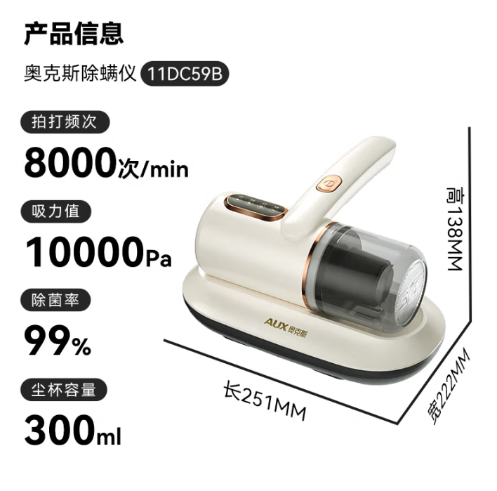 奥克斯(AUX)无线除螨仪家用手持小型床宝吸尘器床上大吸力除菌除螨虫除尘器拍打AXC-11DC59B 椰奶白+3滤芯
